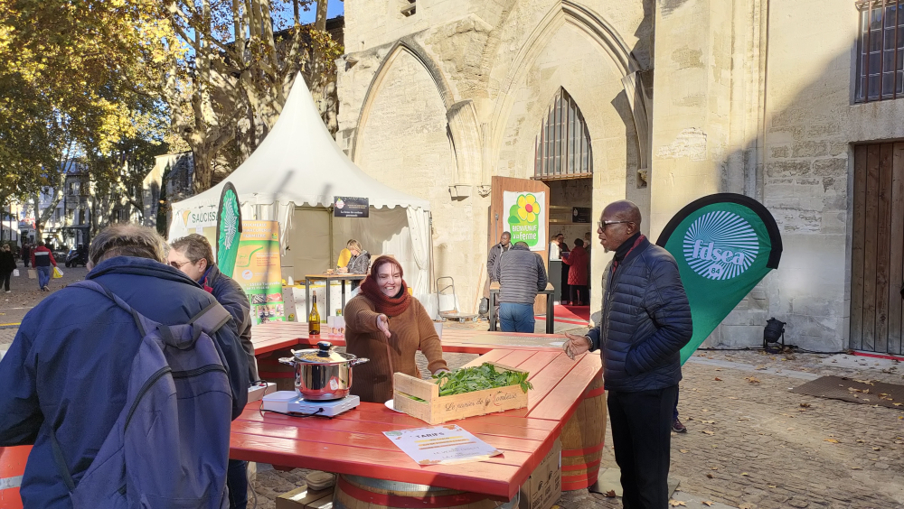 À peine ouvert, ce vendredi 17 novembre à midi frisquet - balayé par un mistralet frais -, le 18e marché du 'Week-end gastronomique' reçoit les premiers visiteurs, impatients de retrouver leurs habitudes et leurs gourmandises préférées. L'église des Célestins, parée d'un chaud tapis rouge, est l'écrin idéal pour promouvoir les produits du terroir, mitonnés avec passion par les agriculteurs de 'Bienvenue à la ferme' de Vaucluse et de cinq régions de l'Hexagone.
