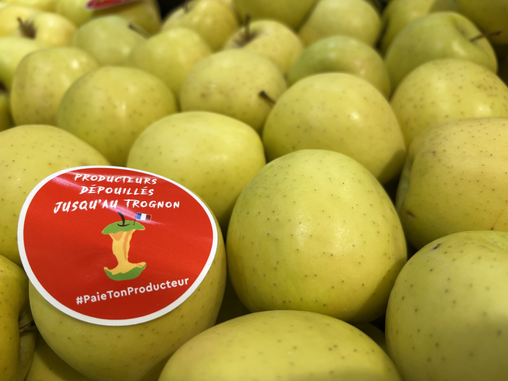 Dans les magasins, des stickers "Producteurs dépouillés jusqu'au trognon #paietonproducteur" étaient collés un peu partout.
