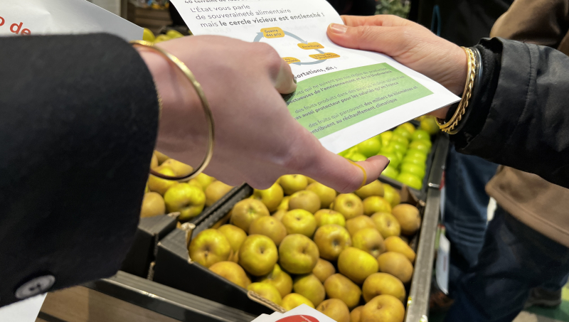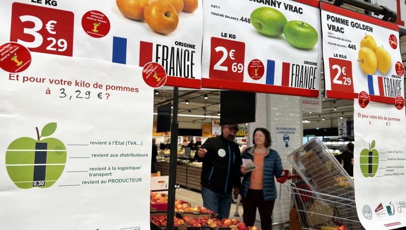À coups de tracts distribués et d'explications lancées aux consommateurs, la sensibilisation fait son chemin. Quelques centaines de mètres plus loin, à Lidl, le message passe moins bien auprès du personnel, peu ravi de voir un groupe d'une quinzaine d'agriculteurs faire irruption dans le magasin. Mais les acheteurs sont réceptifs. "Aujourd'hui il y a deux personnes qui se font voler...", commence l'arboriculteur. "Vous et nous", lui répond une cliente.