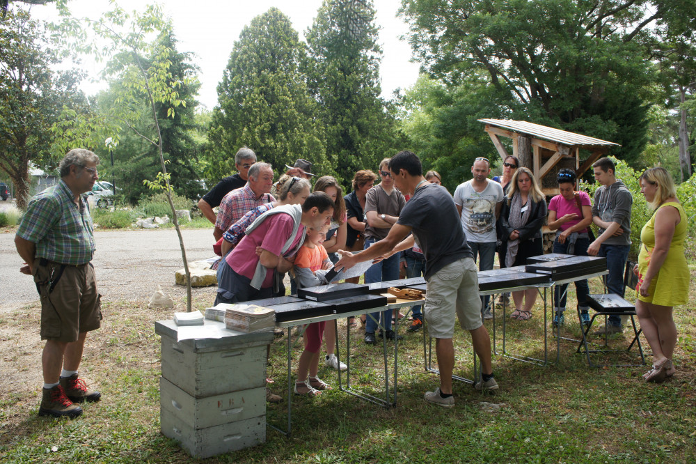 À proximité d'un hôtel à abeilles, le public découvre le 18 juin la diversité et l'écologie des abeilles sauvages, à l’Inra de Montfavet. ©Inra Paca