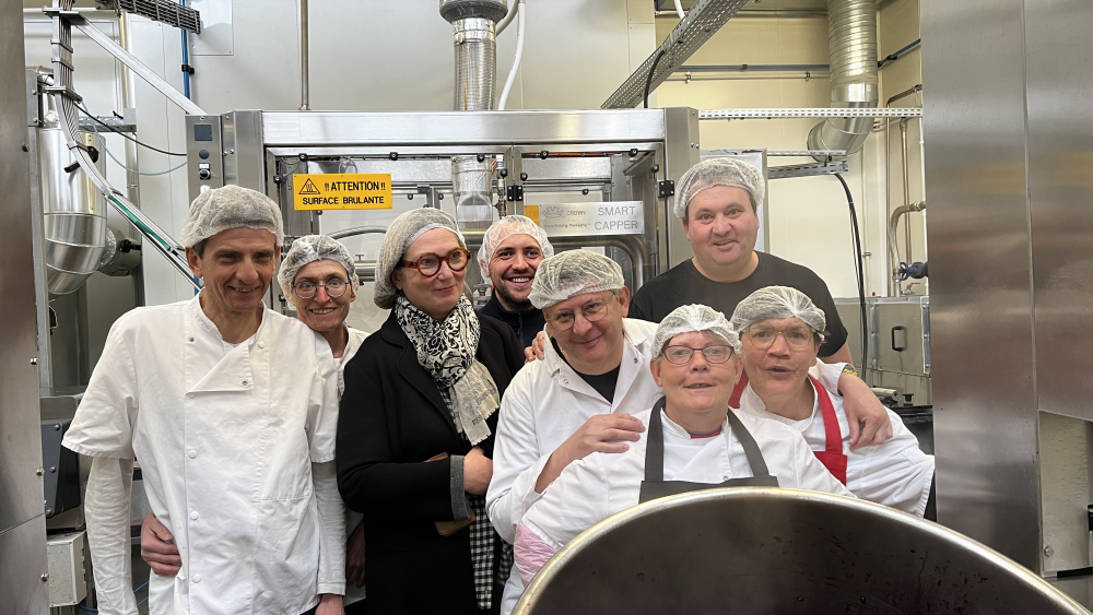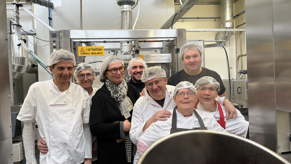 La directrice de l'association AVEPH Catherine Gentilhomme et l'équipe de l'atelier confiturerie