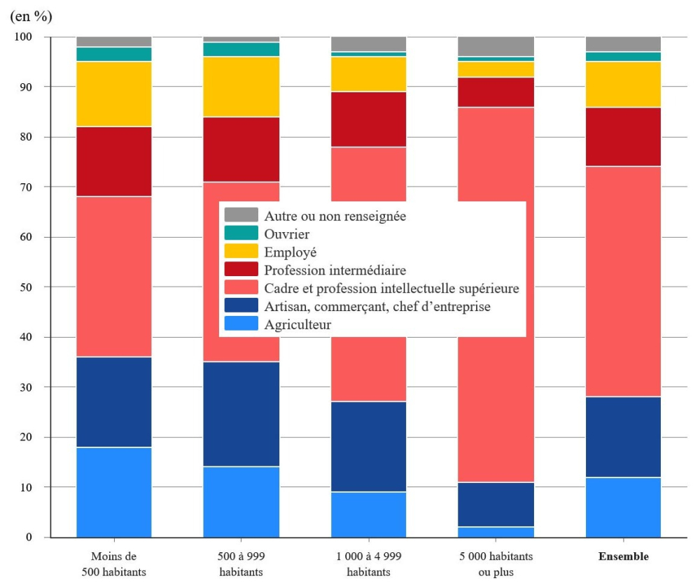 Les indépendants (artisans, commerçants, chefs d'entreprise) représentent une part plus importante chez les maires (17%) que dans la population majeure (11%), à l'exception des communes de 5 000 habitants ou plus. Enfin, les agriculteurs sont également surreprésentés, particulièrement dans les petites communes. Ils représentent un maire sur dix contre moins de 1% de la population dans la région.