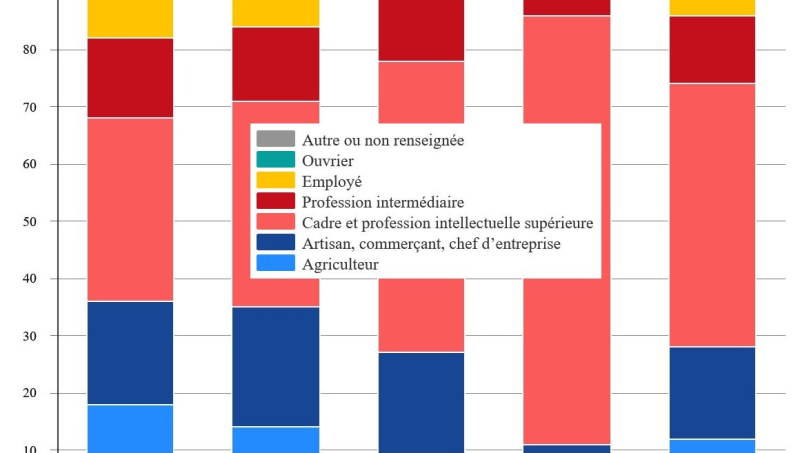 Dans leur dernière activité professionnelle, près de la moitié des maires étaient cadres ou professions intellectuelles supérieures, contre 13% dans l'ensemble de la population adulte (voir graphique).