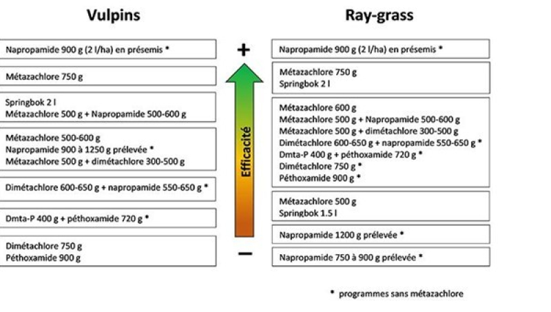 Il faut rappeler que la napropamide, en pré-semis incorporé est certes contraignante, mais reste de loin la solution la plus efficace contre le vulpin et le ray-grass. Dans la gamme des herbicides de prélevée, seuls les produits à base de métazachlore, de dimétachlore, de DMTA-P et de péthoxamide sont efficaces sur ray-grass.