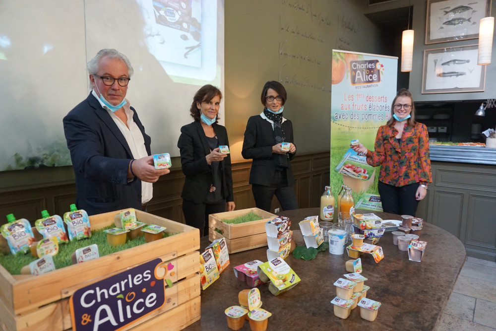 « Nous avons eu la chance de pouvoir continuer à travailler sans discontinuer durant le confinement, grâce à notre activité en grande surface » reconnaît Thierry Goubault, P.-D.G. de Charles & Alice. En effet, le chiffre d’affaires de 165 millions d’euros est resté stable cette année. Alors, malgré la baisse d’activité du secteur Restauration hors foyer (RHF) – sur lequel la marque est leader avec 500 000 consommateurs par jour – elle a continué d’innover. Et pour cette rentrée, elle lance le premier dessert issu de vergers Haute valeur environnementale. Deux petits pots individuels, à base de pomme, sont donc marqués du label HVE. Avec un code couleur pour les chefs de cuisine : bleu, c’est le sans sucre ajouté, vert, c’est l’allégé1. Et le label HVE permet pour les chefs de répondre à la loi Egalim, qui exige une montée des produits sous signe de qualité. Ce sont ainsi deux nouveautés qui vont rejoindre les 115 références Charles & Alice, pour la restauration dans les écoles, hôpitaux, entreprises, maisons de retraite…