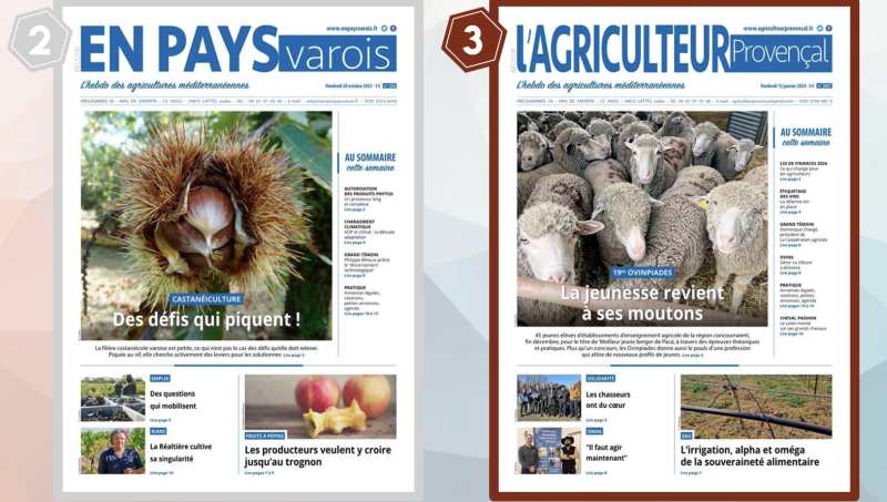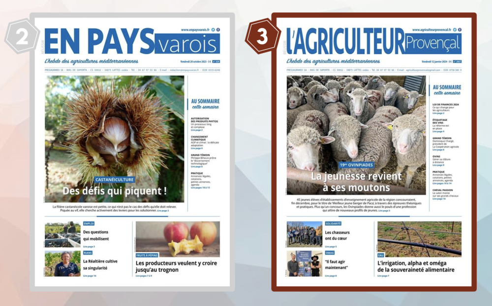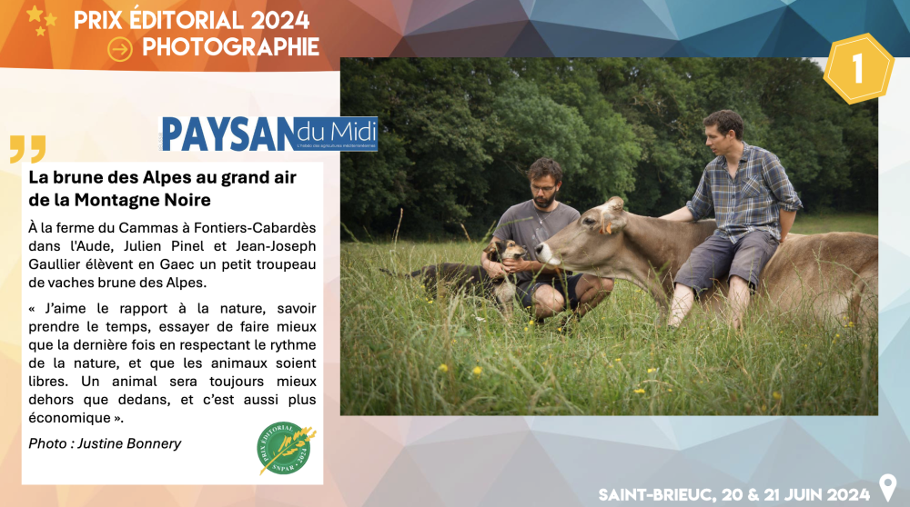 De l'or, de l'argent, du bronze. Cette année encore, la presse agricole méditerranéenne n'a pas démérité, ramenant des terres bretonnes trois trophées dans le Sud, à l'occasion du prix éditorial du SNPAR. Le Syndicat de la presse agricole et rurale, qui rassemble l'ensemble des titres de presse départementaux et certains titres nationaux dédiés à l'agriculture, organise chaque année à l'occasion de son congrès un prix éditorial qui salue la meilleure Une, photo, le meilleur dessin de presse, article et la meilleure initiave éditoriale. La meilleure photographie a été attribuée à Paysan du Midi, pour une photographie réalisée par Justine Bonnery, à la ferme du Cammas à Fontiers-Cabardès dans l'Aude, où Julien Pinel et Jean-Joseph Gaullier élèvent un petit troupeau de vaches brune des Alpes. Les deuxième et troisième prix de la meilleure Une reviennent à En pays varois pour les défis qui piquent de la châtaigne et à l'Agriculteur provençal pour la jeunesse qui revient à ses moutons. Trois prix sur les 19 lauréats qui ont été récompensés.