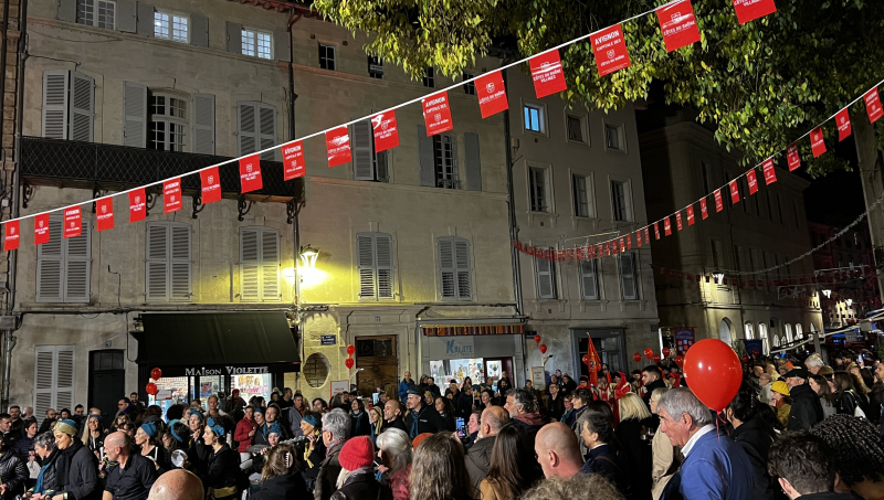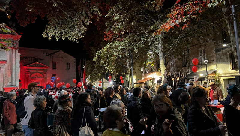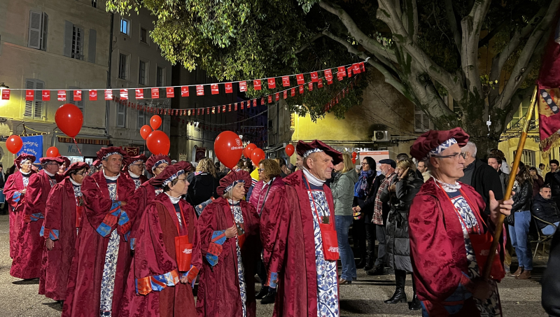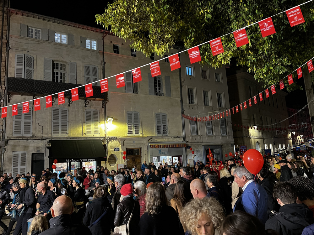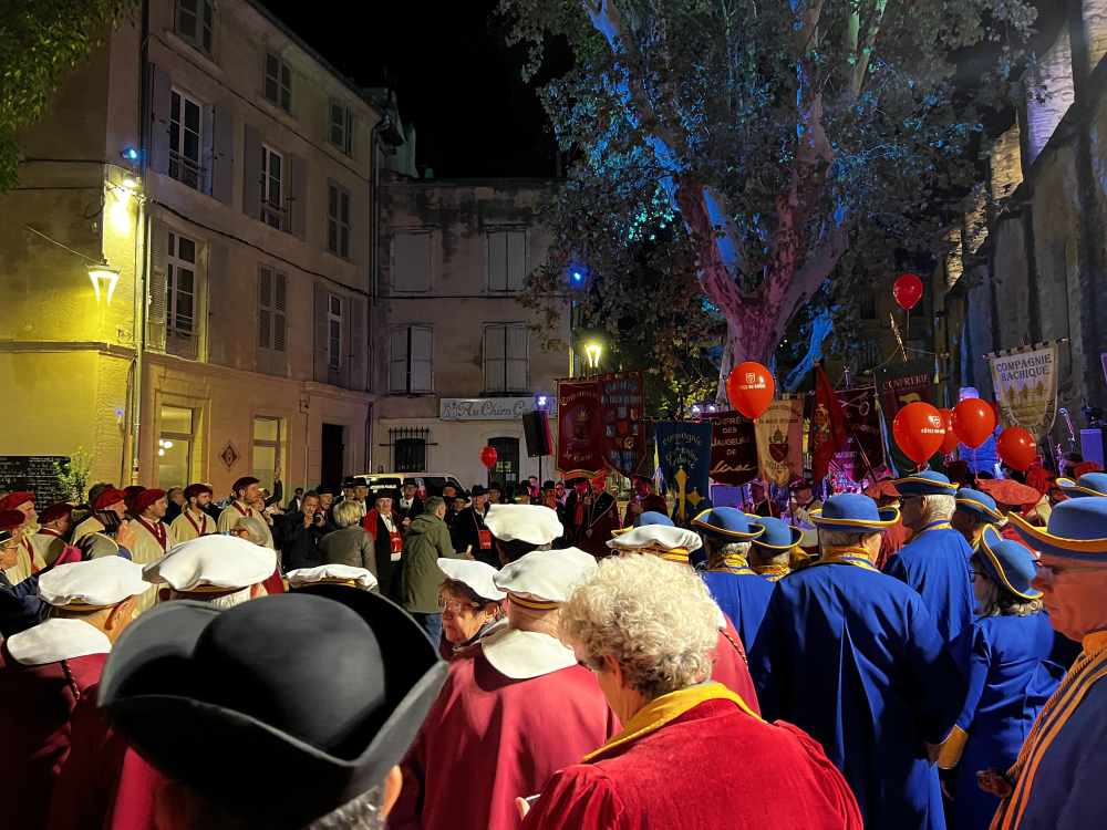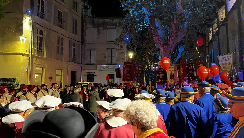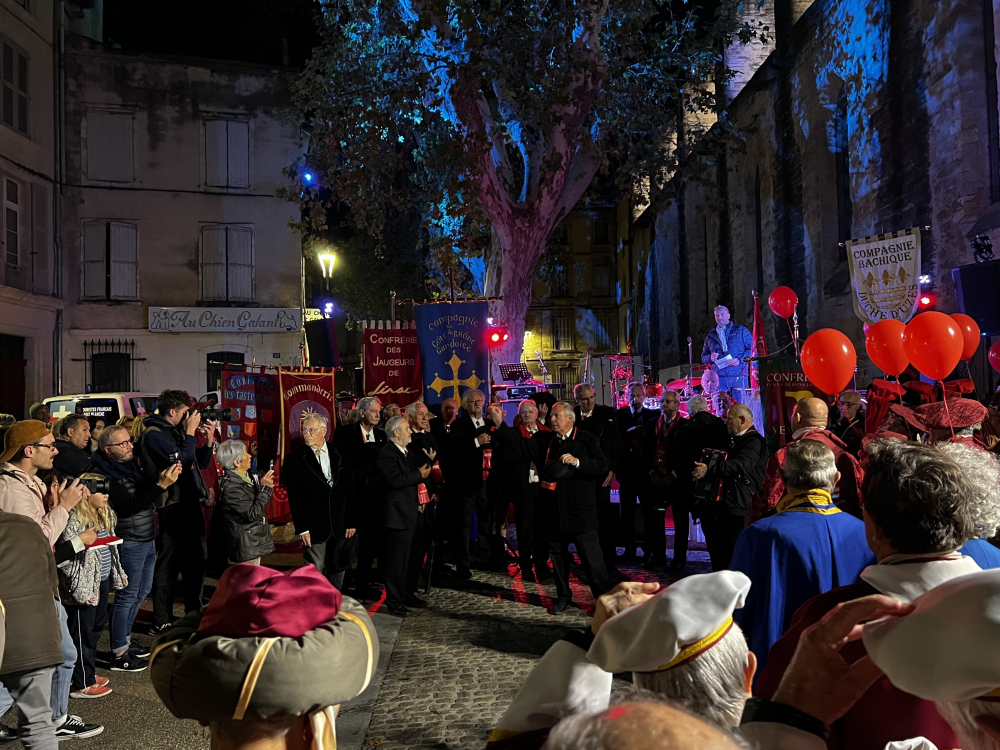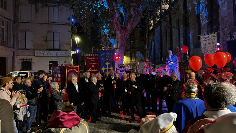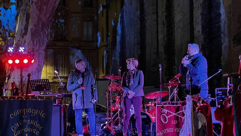 Cette année, le défilé change de sens, passe par les Corps Saints pour s'arrêter place Saint-Didier où trône la scène. Après un petit "Provençau, veici la Coupo" chanté en chœur, Philippe Pellaton, président fraîchement réélu à l'interprofession des vins de la Vallée du Rhône, et Cécile Helle, maire d'Avignon, montent sur l'estrade pour exprimer leurs mots de bienvenue.