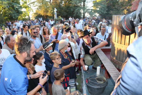 Dès la fin de la proclamation, c'est la ruée vers le pressoir où les trois vignerons de Saint-Roman-de-Malegarde s’activent pour réaliser la pressée traditionnelle et la dégustation du raisin nouveau. C’est long, très long pour obtenir les premières gouttes du jus de raisin 2021. Les trois se relaient, transpirent, les verres se tendent, mais il faut attendre encore et encore. Enfin, un petit filet de jus arrive, les sourires aussi, la pressée est enfin là pour le plaisir de tous.