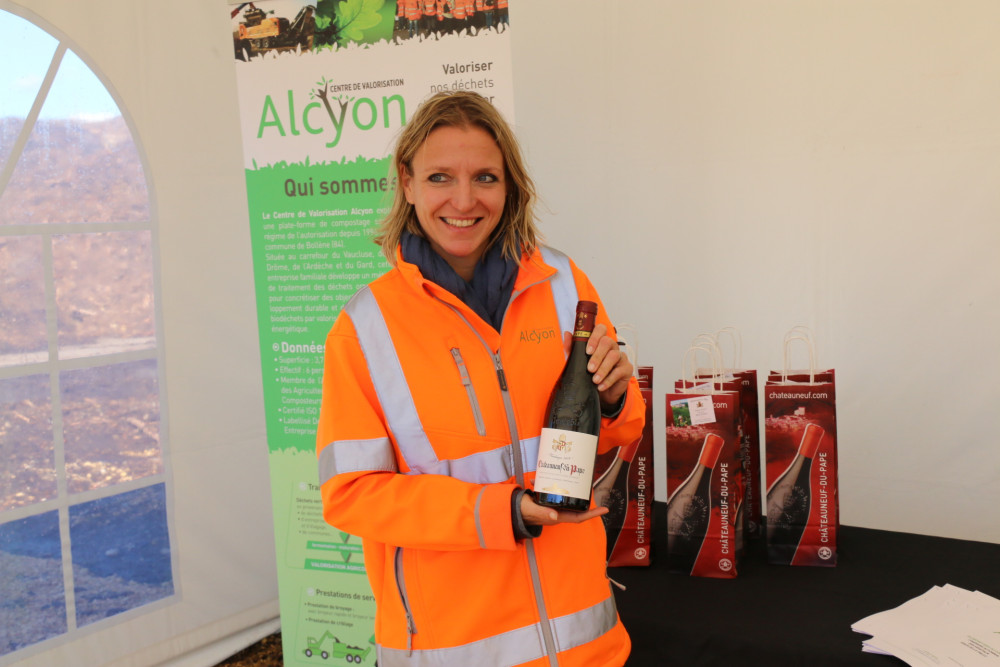 Cindy Coq, directrice d'exploitation du centre de valorisation des déchets verts Alcyon, avec une bouteille du Domaine La Bertaude à Orange. La viticultrice, Magali Point a obtenu son cru avec des vignobles amendés avec du compost certifié d'Alcyon.