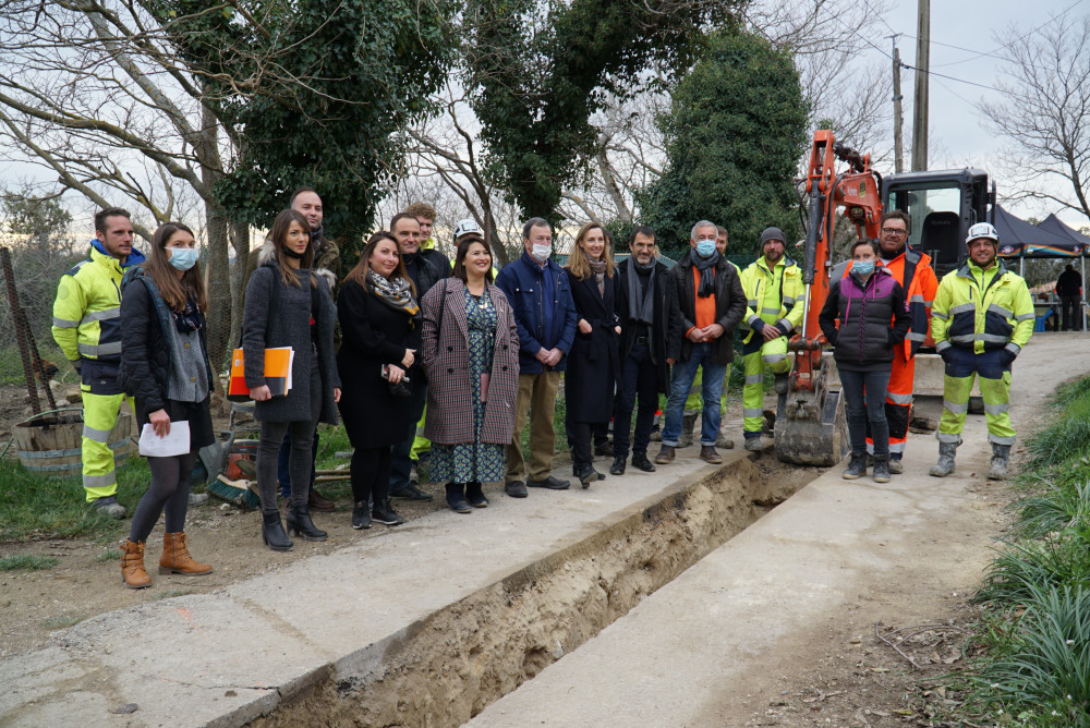 Le président, Alain Guillaume, la directrice, Sandrine Pignard, l’équipe du canal de Carpentras, les maires locaux, et les équipes du groupement d’entreprises Dall Agnola/Teyssier en charge des travaux, lors de la visite du chantier à Saint-Pierre-de