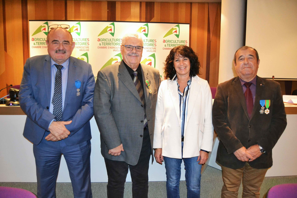 À l'issue de la session, Christian Gely, 4e vice-président de la Chambre d'agriculture, a reçu la médaille d'officier dans l'ordre du Mérite agricole des mains d'André Bernard et de Jean-Paul Vilbert, pour l'Association des membres de l'ordre du Mérite agricole de Vaucluse (Amoma 84), en présence de sa femme, de ses deux enfants et six petits-enfants, et de ses amis.