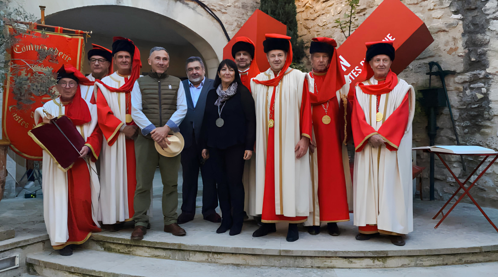 Jeudi 4 avril, la Commanderie des Costes du Rhône était encore à Avignon pour un chapitre exceptionnel organisé à l'occasion du départ en retraite de la "Gardienne du temple Inter Rhône", Corinne Pons, dans la cour de l'hôtel de Rochegude à Avignon. Elle était au service de l'interprofession depuis 38 ans en tant que responsable du service comptabilité. En présence du président, Philippe Pellaton, et des deux anciens présidents, Michel Bernard et Christian Paly, mais aussi de nombreux vignerons, dont Marcel Guigal, ce chapitre était placé sous le signe de la reconnaissance envers la fidélité et l'amitié unissant l'ensemble des collaborateurs de la grande maison des vins "à l'impétrante de ce jour, amoureuse des chiffres certes, mais aussi et surtout ardente ambassadrice des vins et des terroirs de notre Vallée du Rhône, et qui va désormais rejoindre la grande famille vigneronne", commentait la Commanderie sur ses réseaux sociaux. Le Grand maître délégué, Andéol Pommier, a appelé sur elle la bénédiction de Bacchus et de Saint Vincent avant de la faire Chevalier.