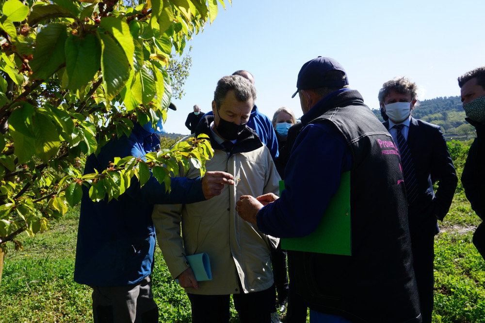 Face au Préfet de région, Christophe Mirmand, Olivier Curel explique les dégâts du gel sur les cerisiers de son exploitation. (© ML)