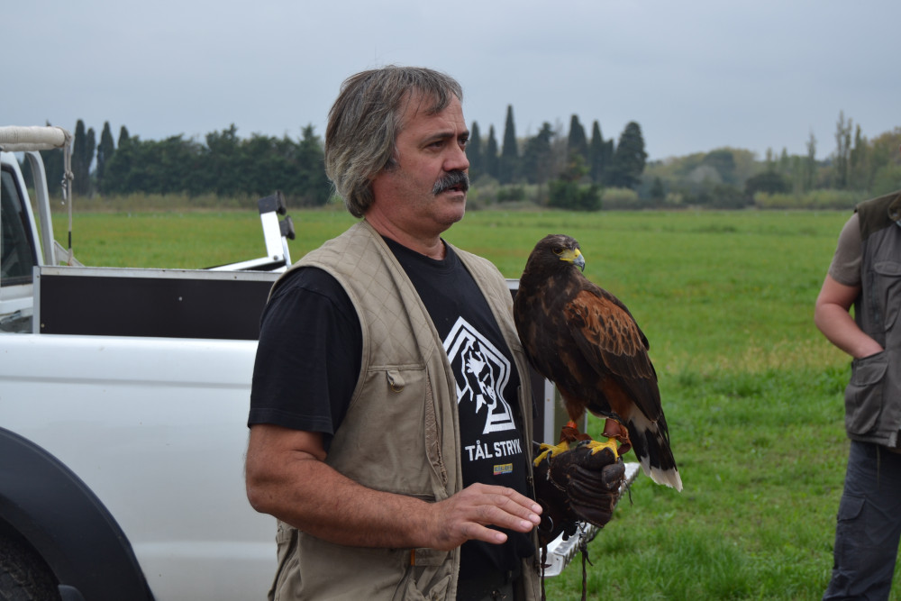 « L’effarouchement est une méthode qui existe depuis plusieurs années, bien qu’elle soit peu connue. On travaille principalement dans des entrepôts, pour les villes ou les structures agroalimentaires, comme Perrier à Vergèze dans le Gard par exemple. Notre but avec ces rapaces c’est d’abord d’éloigner les populations de nuisibles que rien n’effraie plus aujourd’hui, et qui sont parfois protégées, ce qui complique la lutte. On peut intervenir sur toutes espèces. Idéalement, il faut intervenir deux fois, le matin et le soir, pour inscrire dans le mental des nuisibles la présence de prédateurs. Naturellement, la buse n’attaquera pas les corneilles, ce serait même plutôt l’inverse. Mais mes oiseaux ont été dressés et le résultat est que les corneilles fuient et quittent la zone de production. »