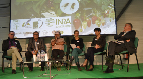 Luc Barbier, président de la FNPF, Gérard Roche, vice-président de Légumes de France, Philippe Massardier, directeur technique de la Sicoly, Claire Weydert, du CTIFL, Sylvie Colleu, de l’Inra, et Bertrand Bourgouin, de la DGAL. ©C.Z.