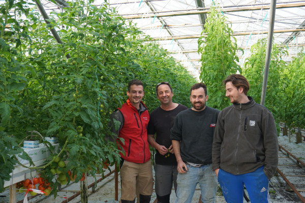 Dans ses serres à Sarrians, Jean-Christophe Bres entouré de ses trois fils : Baptiste, Clément et Timothée.