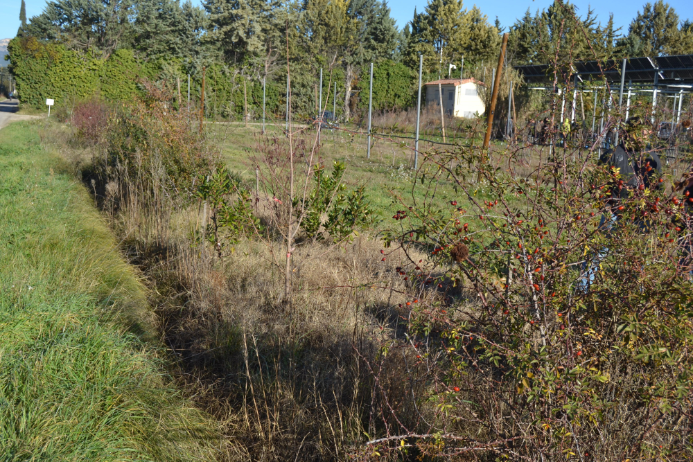 Cette haie diversifiée a été installée sur un paillage de dalle biodégradable en géochanvre de 50 centimètres qui, trois ans après, a quasiment disparu.