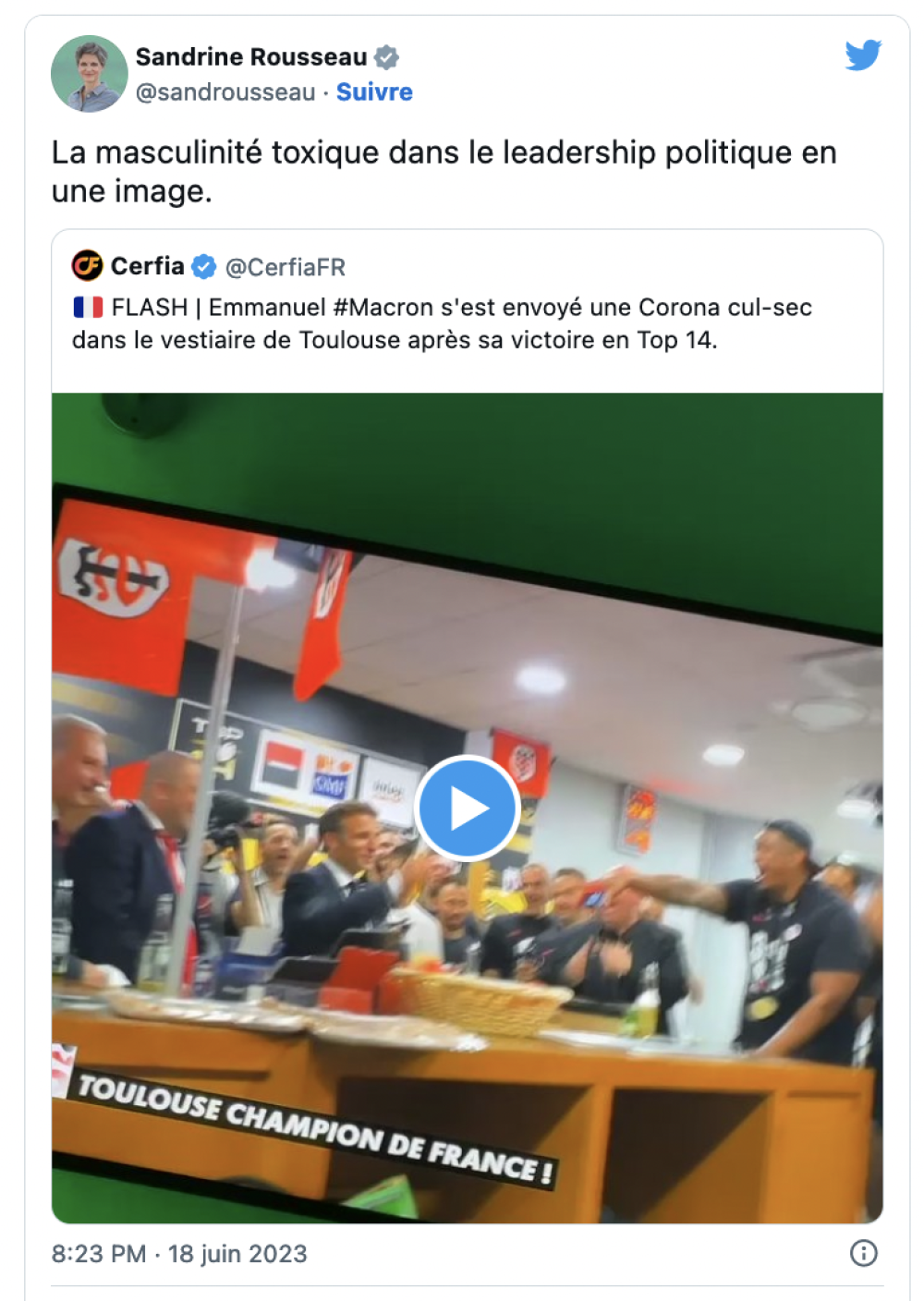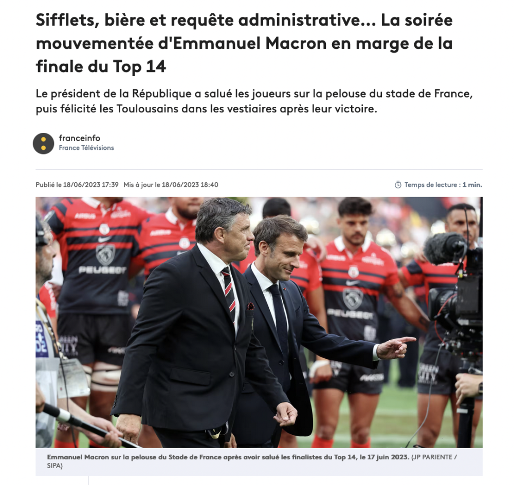 Le débat de la semaine sur les réseaux sociaux concerne non pas la victoire du Stade Toulousain en final du Top 14 - le Stade Toulousain est le club qui a remporté le plus de titres de champion de France de rugby avec 22 Boucliers de Brennus dérochés, dont 3 dans les 5 dernières années - mais bien la bière cul sec, descendue par le président, Emmanuel Macron, avec les joueurs toulousains. La vidéo a fait le tour des réseaux sociaux. On voit le chef de l'État fêter la victoire des Toulousains avec une bière Corona, qu'il a bue d'un seul trait, encouragé par les joueurs. La députée écologiste Sandrine Rousseau - pour qui le barbecue est le symbole de la masculinité -, a dénoncé dans cette image "la masculinité toxique dans le leadership politique". Un cul-sec présidentiel (et providentiel pour la marque), tout ce qu'il y a de plus classique dans les 3e mi-temps du monde de l'ovalie. Mais est-ce vraiment le cœur du problème ? Et bien non ! Corona est une bière mexicaine. Il aurait mieux valu une Despey(rados) d'origine alsacienne, et désormais produite en Alsace, dans le Nord, et près de Marseillllle !