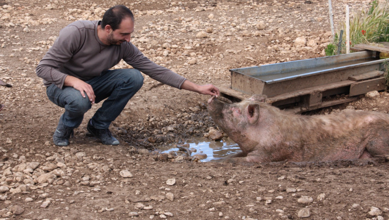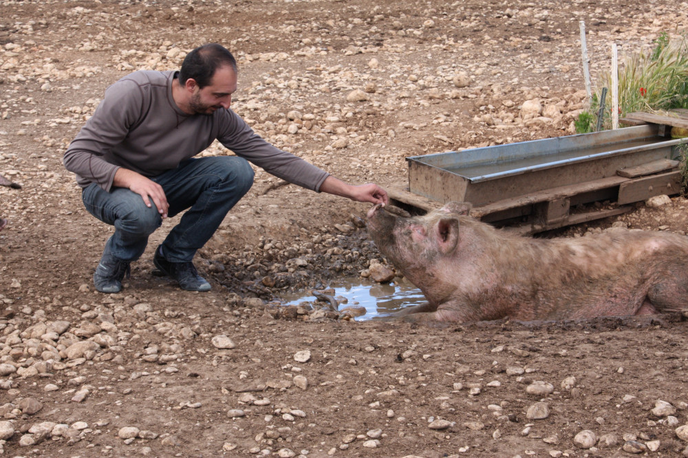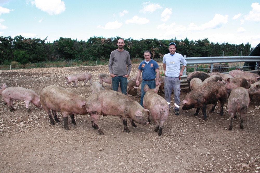 L’idée de monter un élevage est née…au bord d’une autoroute. David Aurand et son cousin Fabien Lantin travaillent alors à la construction et l’entretien des murets séparant les voies. Le premier, fils et petit-fils d’agriculteurs, détenteur d’un CAP de boucher, commençait à constituer un cheptel lorsqu’il a suggéré au second, issu d’une famille de paysans, de s’associer. Il avait déjà arraché tous les plants de fraisiers, ceps de vigne et cerisiers mis en terre par son père à qui il a succédé sur l’exploitation. Après chèvres, brebis et vaches, c’est finalement des cochons qui ont intégré les parcs aménagés sur les quatre hectares et demi de l’exploitation des Aurand à Monteux. La décision est prise au cours de l’hiver 2014: puisque tout est bon dans le cochon, autant faire en sorte que tout soit de qualité. « On a vendu nos dernières vaches pour construire un séchoir à crédit et l’aménager », explique David Aurand. « Auparavant, on tuait un à deux cochons par mois pour dépanner les magasins de producteurs et on ne pouvait faire que de la viande fraîche. Pour s’en sortir, il fallait qu’on arrive à tout utiliser dans le cochon. »