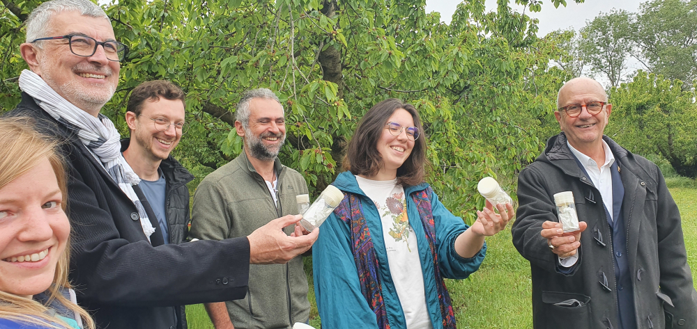 Les équipes de recherche Inrae et Lucien Stanzione, sénateur de Vaucluse, le 6 mai dernier, à l'occasion d'un lâcher du parasitoïde Ganaspis brasiliensis, à Malaucène.
