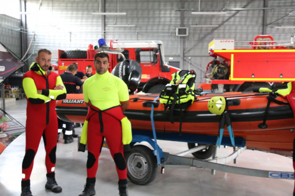 Le préfet s'est ensuite déplacé de la mairie jusqu'à la caserne des pompiers vaisonnaise. Il a été reçu par le capitaine Serge Perrot, chef de la compagnie de Vaison. Toute la panoplie de matériels de lutte contre les inondations a été présentée, notamment le canot de secours nautiques avec deux sauveteurs et leur matériel. Ils disposent de gilets de sauvetages très renforcés à haute flottabilité permettant de porter directement secours en milieu périlleux : « Mais la difficulté dans ce cas », rappelle le colonel J.Y Noisette, « c'est que nous ne pouvons pas lutter contre l'inondation en elle-même, contrairement à un incendie. Il faut attendre qu'elle se termine, et parfois intervenir sans attendre, malgré les risques ». Le responsable du Sdis a rappelé que les pompiers : « sont sensibilisés aux problèmes de crues. Nous avons identifié sur le territoire les points sensibles et nous effectuons régulièrement sur place des exercices pour être prêts ».