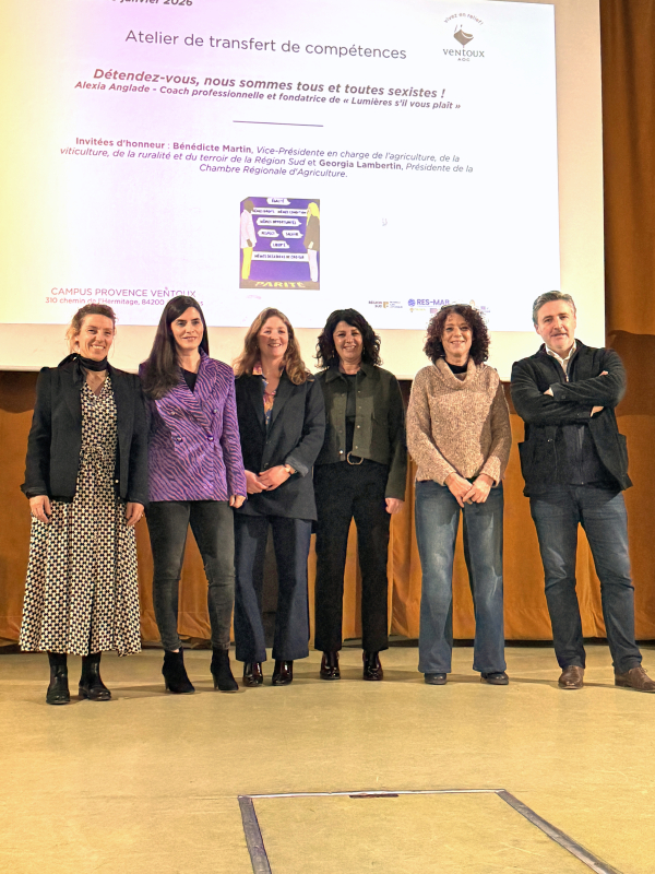 Parmi les invités de l'atelier autour du sexisme et de la parité dans l'agriculture, organisé par l'AOC Ventoux, on peut noter la présence d'Alexia Anglade, qui animait la conférence où sont intervenues Georgia Lambertin, présidente de la Chambre régionale d'agriculture, et Bénedicte Martin, vice-présidente de la Région Sud. Et au milieu de toutes ces femmes, le président de l'AOC Ventoux, Frédéric Chaudière.