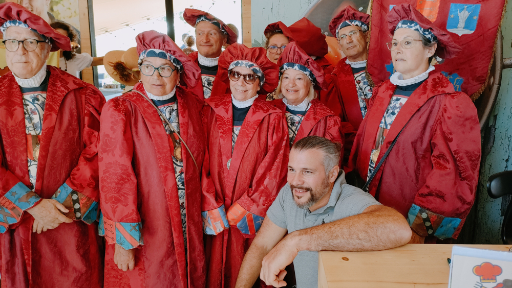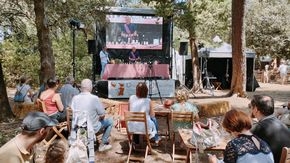 Quelques pas encore, puis apparaît l'imposante estrade des démonstrations culinaires des Disciples d'Escoffier. Le public suit les conseils de dégustation d'Yves Vanaert, vigneron en AOP Ventoux, également producteur d'huile d'olive. Mais bien d'autres se succéderont au perchoir.