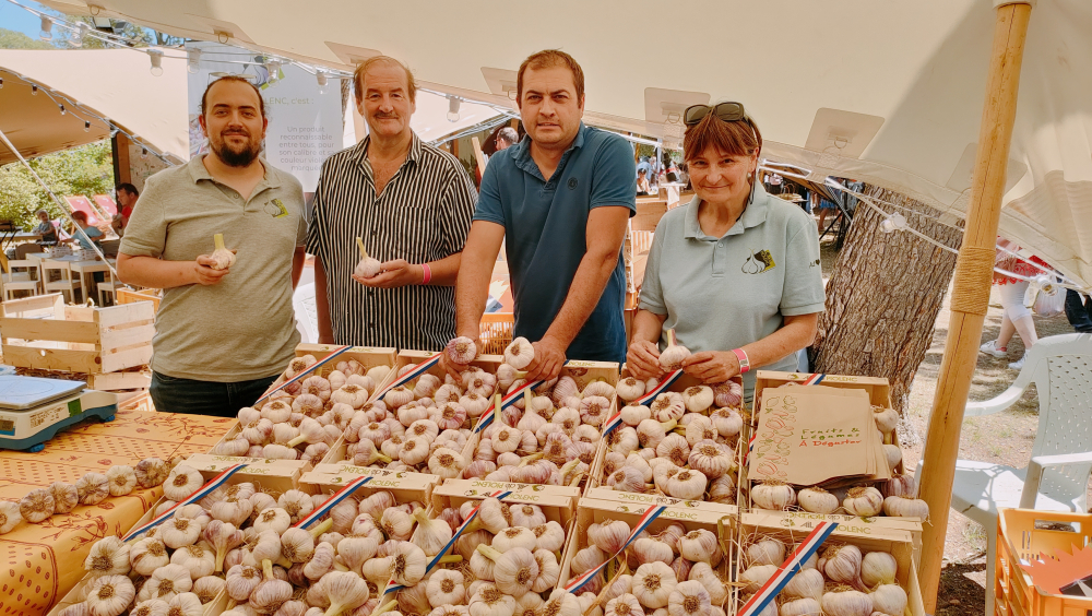 Toujours fidèles, les producteurs de l'ail de Piolenc sont venus en équipe. Gilles Favalier, son épouse, Francine, et Sylvain Bernard sont intarissables : "Notre ail a la particularité d'être violet. Nous sommes là pour promouvoir ce produit unique, dont l'association regroupe six producteurs sur les communes de Piolenc, mais aussi d'Uchaux, Caderousse, Mornas, Mondragon et Orange. Nous attendons de pied ferme le classement de notre production en AOP. Le dossier est en ce moment en cours d'examen à l'Inao. Nous sommes en pleine récolte, et cette année, elle est jolie !".