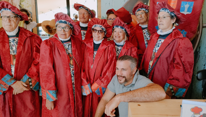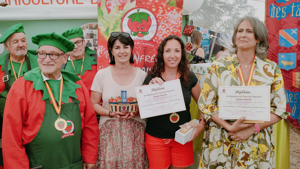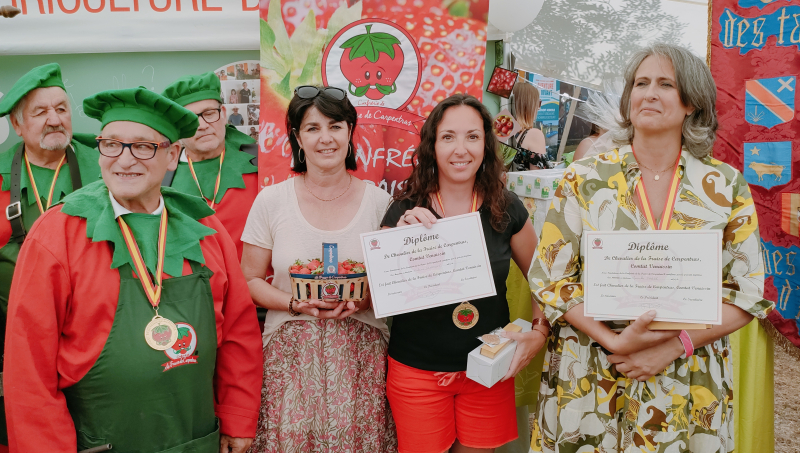 Après le grand tour des étals, les personnalités se retrouvent pour l'intronisation de Marielle Fabre, conseillère départementale, et Violaine Démaret, préfète de Vaucluse, par la Confrérie de la Fraise de Carpentras. Son président, Dominique Begnis, est aux anges et ne tarit pas d'éloges envers Violaine Démaret : "De gros dossiers - lavande, élevage, cerise, eau... - sont sur votre bureau, et vous allez sur le terrain pour en comprendre les réalités. Nous savons que vous êtes une combattante, et nous sommes rassurés d'avoir une personne au service de l'État comme vous à nos côtés".