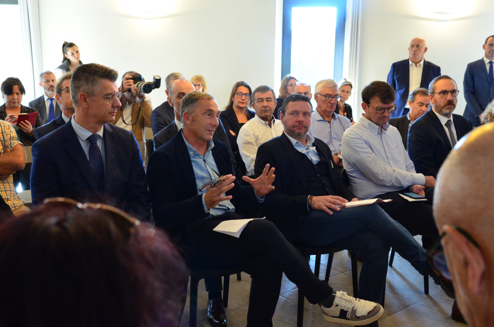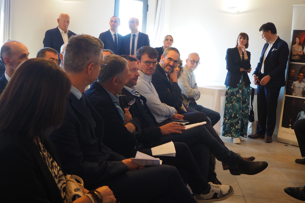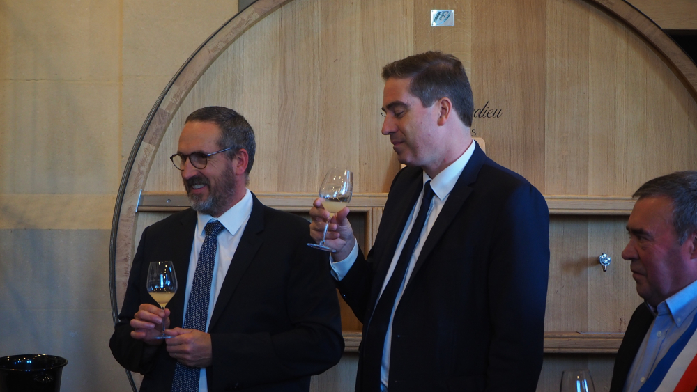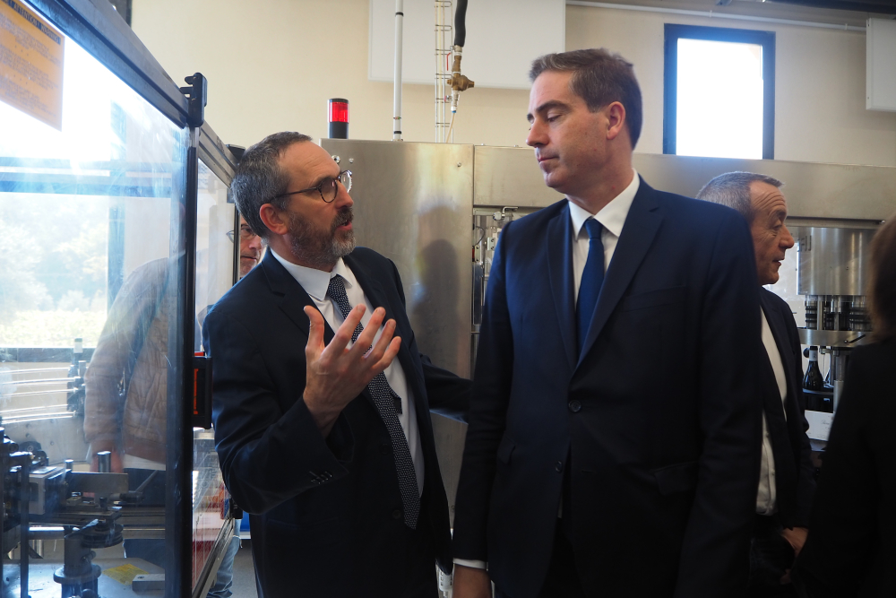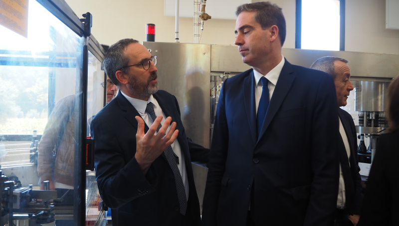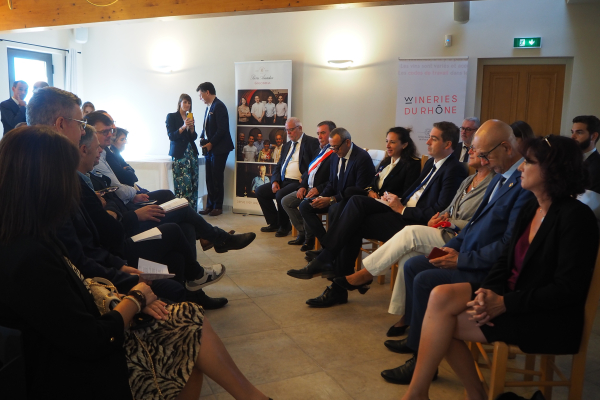 Olivier Becht (aux côtés de la préfète de Vaucluse), ministre délégué, chargé du Commerce extérieur, de l'Attractivité et des Français de l'étranger, s'est rendu à Gigondas, puis à La Tour-d'Aigues, chez Marrenon, pour rencontrer les viticulteurs et leur présenter les outils de soutien à l'exportation à leur disposition.
