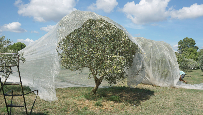 Dans la réflexion menée sur l'irrigation, le couple a également souhaité intégrer la problématique des maladies du feuillage, en raison d'une pression mouche importante durant environ la moitié de l'année, "très fortement liée aux conditions d'humidité de la parcelle". Comme l'explique leur conseillère, "ils ont cherché un compromis entre des objectifs divergents, entre une récolte mécanique qui se tient entre fin octobre et mars, la recherche d'une maturité optimale en réponse au cahier des charges de l'AOC Huile de Nice, une conduite sous filet pour lutter contre la mouche, sans oublier la présence notable des sangliers dans la zone". Pour y répondre, ils ont mis en place une gestion différenciée de l'irrigation sur l'année, en fonction des saisons et des contraintes précitées. Ainsi, en période de stress hydrique, l'objectif est de limiter l'évapotranspiration et la concurrence hydrique avec de l'enherbement, en place une bonne partie de l'année. "En 2022, le climat, très sec, a eu un impact sur l'oliveraie. Nous avons donc décidé de modifier les pratiques, avec la mise en place d'un arrosage journalier en petite quantité, afin de relancer la vigueur des arbres. Par ailleurs, l'olivier produisant sur bois de deux ans, il fallait laisser pousser les branches", résume Maude Diamiens.