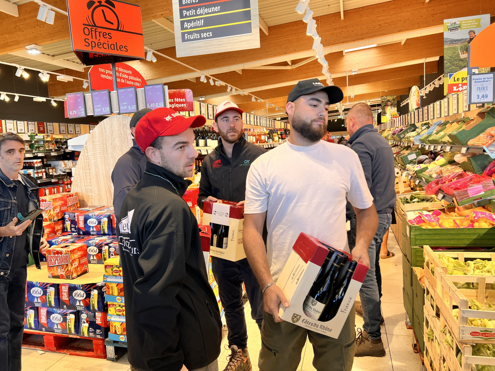Ce lundi matin, la FDSEA et les Jeunes agriculteurs du Vaucluse ont mené une action dans un des magasins de l'enseigne, pour protester contre son offre à moins de 2 € la bouteille en AOP Côtes du Rhône.