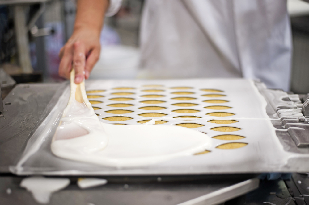 Une fois la pâte à calisson formée, le façonnage débute. Les calissoniers placent la feuille d'hostie sous le moule à calissons, puis libèrent la pâte à calisson qui va remplir les petits calices. Ils y étalent ensuite une fine couche de glace royale, faite de sucre glace et de blanc d'œuf. Les calissons sont ensuite enfournés durant une dizaine de minutes pour que la glace royale, mate et immaculée, atteigne son degré de perfection.