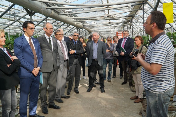 Elus, représentants de l'Etat et de la grande distribution ont été reçu chez Jean-Christophe Bres, producteur de fraises et tomates à Mazan pour Rougeline. © M.S.