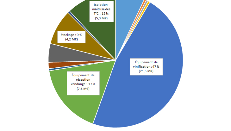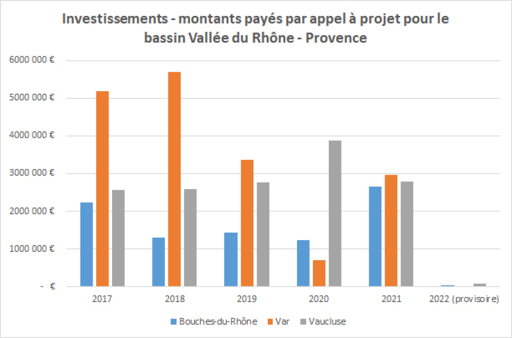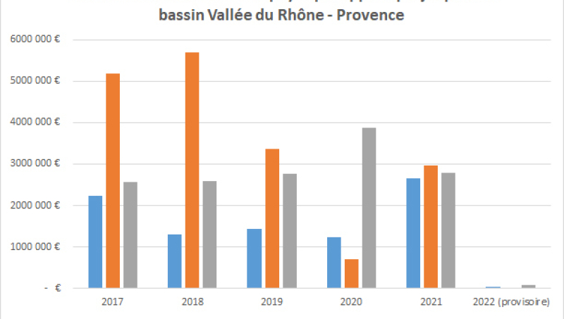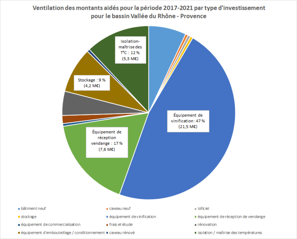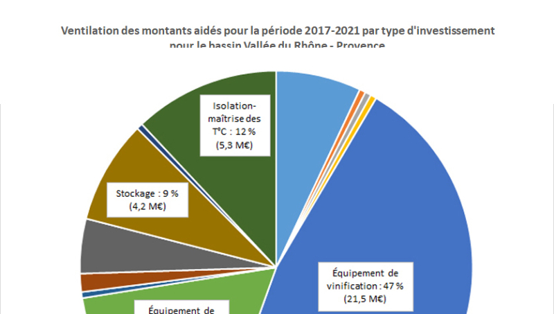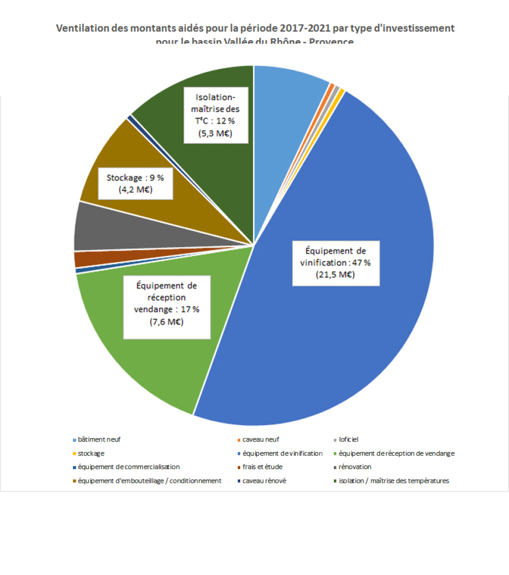 Sur la période 2017-2021, les investissements en vinification ont représenté 47 % des aides versées dans le cadre du dispositif, soit 21,5 millions d'euros, dans le bassin Vallée du Rhône-Provence.