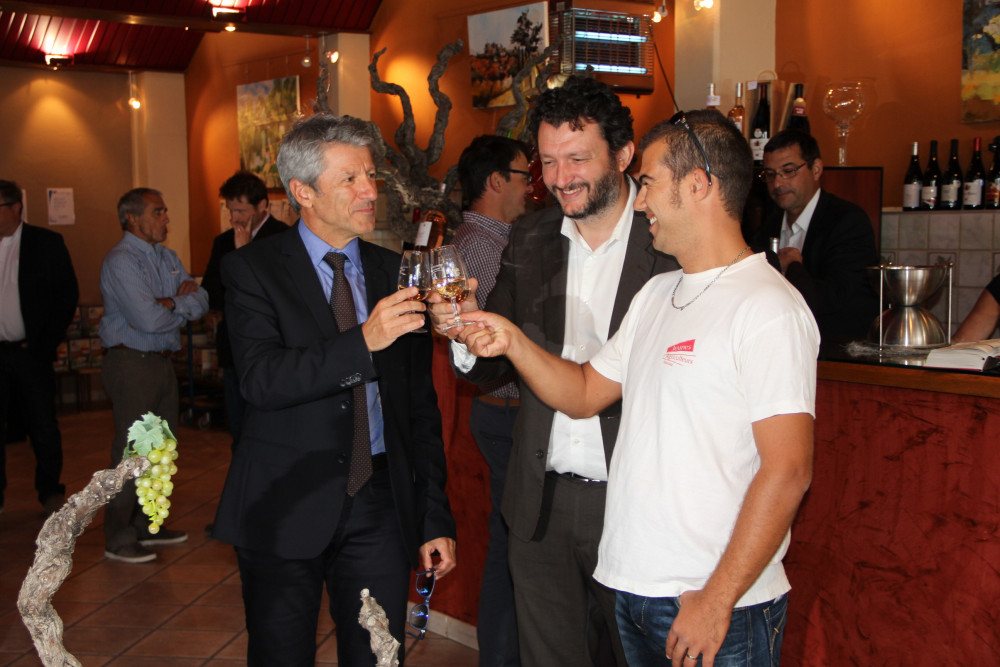 Après cette entrevue, le président Pascal Duffrène présente la coopérative de Sérignan, pays du célèbre entomologiste Jean-Henri Fabre, établie sur un terroir typique comprenant une dizaine de communes où sont produits des vacqueyras, côtes-du-rhône, CDR villages, et des vins de pays. Les 128 vignerons coopérateurs produisent 50 000 hl sur une superficie d'environ 1000 ha. Le directeur-oenologue Marc Thomas, au vu des magnifiques baies apportées au fil des vendanges, est heureux de confier : « On a le sourire, nous pouvons annoncer une bonne récolte 2015 dans toutes les couleurs. La qualité est belle, avec une belle typicité. C'est une très belle récolte, proche de l'exceptionnel ». Ensemble, ils conduisent le préfet dans les dédales de la cave et s'arrêtent, pour terminer, au caveau de dégustation. Mais Bernard Gonzalez chuchote un mot à l'oreille du président. Aussitôt ils l'accompagnent au-dessus d'une cuve emplie à ras bord, plongent des verres et font déguster ce que le préfet convoitait : le vin bourru, « un vin en devenir, entre le jus de raisin et le vin » précise le directeur.