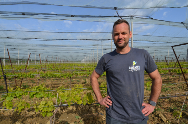 Alban Lambertin devant sa parcelle de raisin de table protégée.