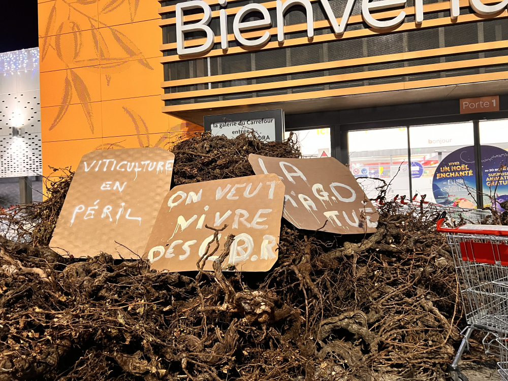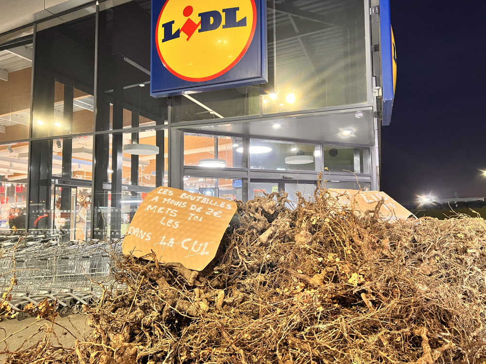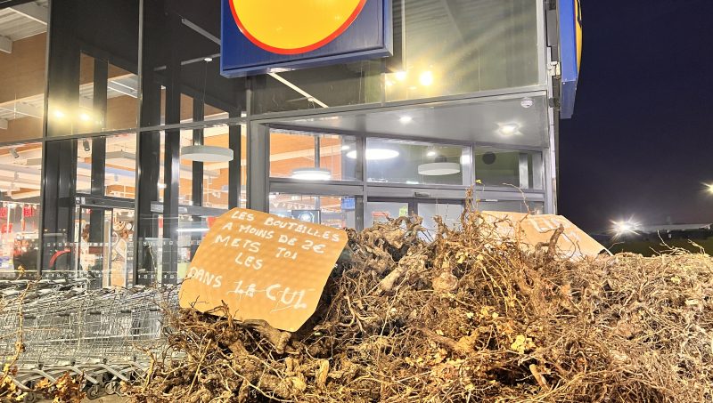 Devant chez Lidl et Aldi, à quelques mètres seulement, la colère n'est pas retombée, bien au contraire. Les enseignes proposent des bouteilles en côtes-du-rhône à moins de 2 €. Et le message est clairement affiché, sur des pancartes placardées sur la devanture : "Les bouteilles à moins de 2 €, mets-les-toi dans le c...".