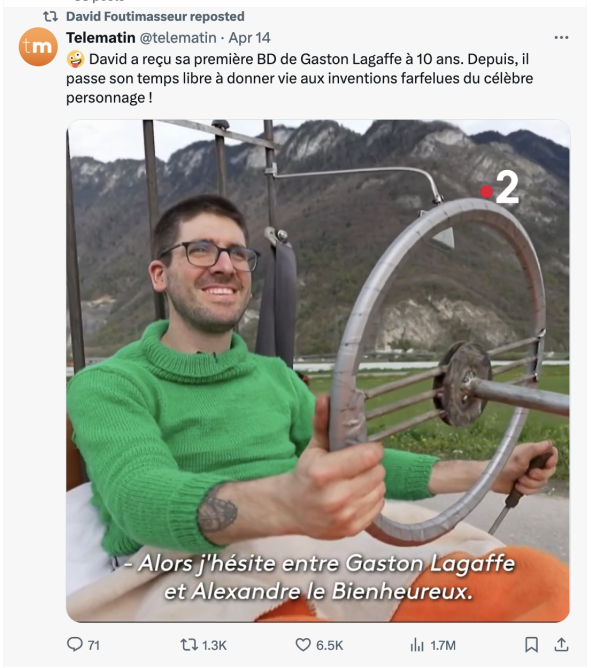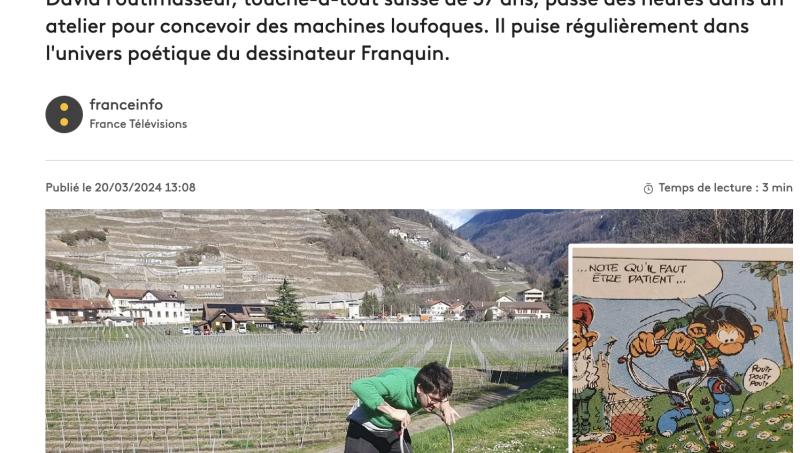 La proposition de la Commission européenne, qui sera examinée au Parlement à Strasbourg du 22 au 25 avril, prévoit entre autres de supprimer l'obligation de jachères. Quel dommage ! Alors que vient d'être présenté, samedi 16 mars, lors du festival BD au Château d'Aigle (Suisse), un engin parfait pour leur entretien : une minuscule tondeuse. Dessinée à l'origine pour la tante Hortense de Gaston Lagaffe, afin de ne pas couper les pâquerettes en tondant le gazon, cette création "grandeur nature", on la doit à un fan suisse, touche-à-tout et bricoleur, du pseudonyme de David Foutimasseur. À 10 ans, il reçoit sa première BD. Aujourd'hui, il est réparateur de locomotive la semaine, et conçoit des inventions un peu loufoques le week-end, puisant ses idées parmi les 350 inventions du plus flemmard des employés de bureau. Le gaffophone ? La caverne'archives' pour dormir ? Ou encore le réseau d'aquarium de Bubulle à travers toute la rédaction ? Et vous quelle est votre invention préférée ?...