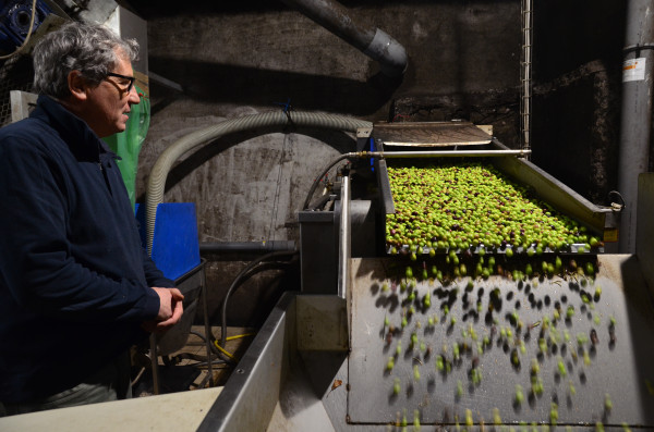 Si les coopérateurs sont très attachés à ce moulin traditionnel, quelques "casses" en cours de campagne ont cependant amené la coopérative à s’équiper, en 2018, d’un second moulin, plus moderne, situé dans les combles. "Il est cependant adapté à notre méthode de production : le broyage, par exemple, ne se fait pas par un système de marteaux, mais avec des disques. Cela nous permet – en plus d’assurer les pics d’apports et de tenir notre rythme de chômage des olives avant extraction, soit quatre jours – d’obtenir un début de fermentation, sans jamais dépasser les deux degrés d’acidité." Une gestion rigoureuse des apports, stockés en pallox dans les combles du moulin, permet de tenir soigneusement ce cahier des charges.