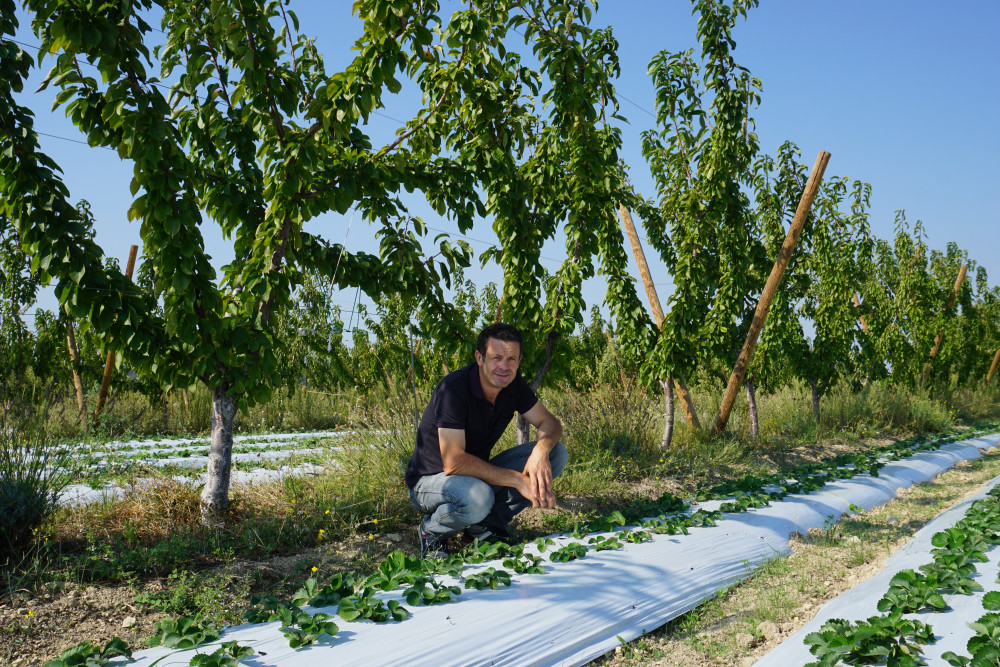 Lionel Chazelle sur une parcelle en agroforesterie, mêlant cerisiers et fraisiers. L’exploitation, issue d’un projet familial, est en biodynamie. (© C. Poulain)