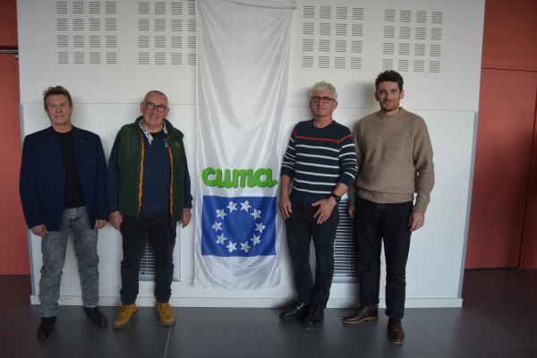 Éric Ereteo, président de la Fédération régionale des Cuma Paca, Gabriel Fayel, président de la Cuma de l'Ouvèze qui accueillait l'assemblée générale cette année, Frédéric Baumet, président des Cuma de Vaucluse, et Alexandre Roux, agriculteur et maire de la commune d'Entrechaux.