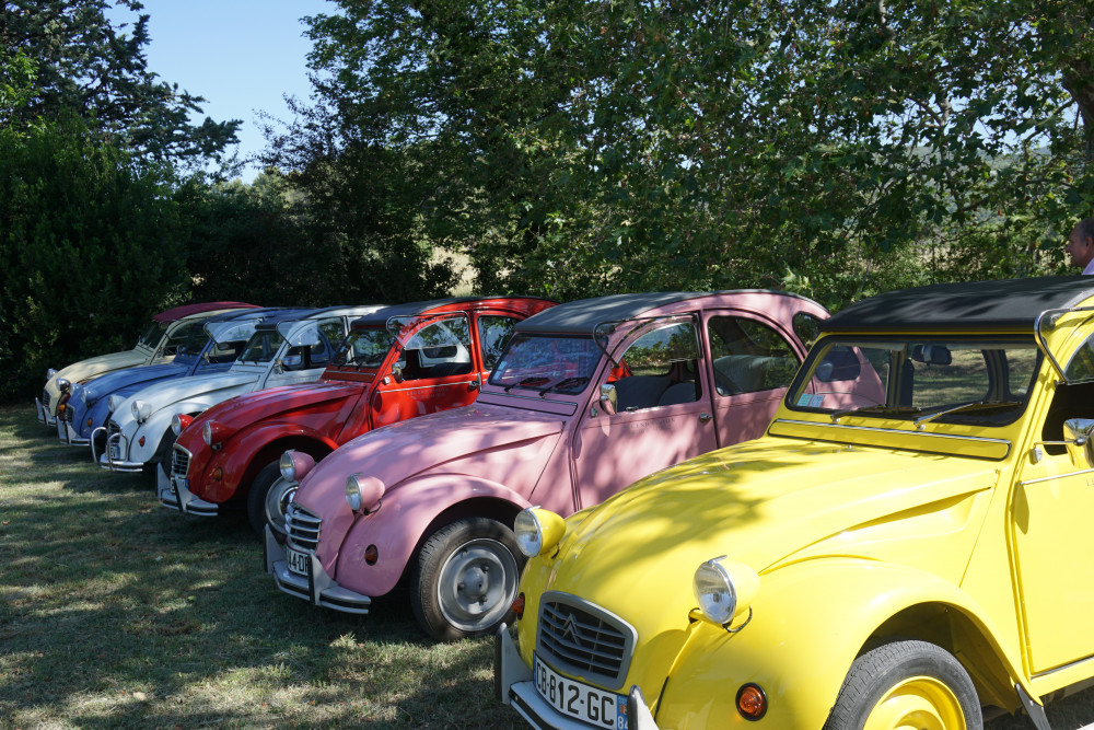 Une panne au détour d’un arrêt, réparée en un rien de temps, ajoutera au folklore de la balade. Les capotes des 2 CV sont ouvertes, malgré le vent et le bruit typique des moteurs d’antan… et les talkies walkies permettent des commentaires entre voitures, en particulier du président qui fait remarquer les spécificités du paysage.