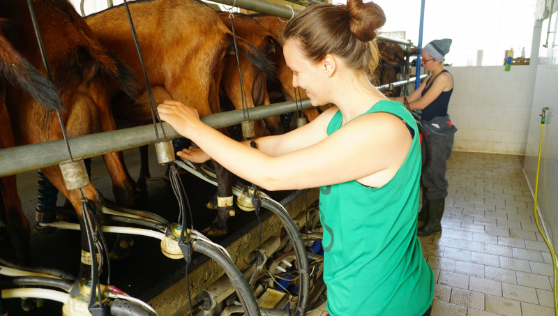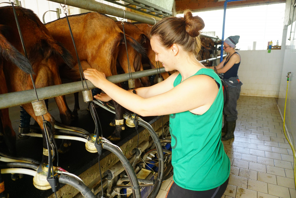 Fin juin, Marie et Pauline ré-enfourchent leurs bécanes, et reprennent la route, direction l’Allemagne. Et précisément le petit village de Bertsdorf-Hörnitz, situé dans le Dreiländerereck (« coin de trois pays » en allemand), une enclave allemande à 5 km de l’Autriche et 5 km de la république Tchèque. Dans ce village rue traditionnel, toutes les terres sont attenantes aux fermes. Elles sont accueillies dans une famille de néo-ruraux qui élèvent eux aussi des chèvres laitières et quelques poules. « Ce sont des gens qui veulent absolument garder du temps pour l’éducation de leur petite fille de six ans », explique Pauline. « Alors ils ont fait le choix d’être en mono-traite. Ils perdent 30% du lait, mais ils gagnent 50% de temps ! »