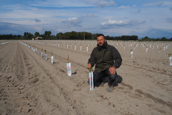Sur cette longue bande de plaine, entre Pernes-les-Fontaines et Saint-Saturnin-lès-Avignon, le mistral prend son élan et souffle avec vigueur. Ce qui a compliqué le travail de l’équipe de plantation, les jours derniers. « Les plants tombaient les uns après les autres, on a dû arrêter le travail à certains moments », explique Vincent Fabre. Ce jeune agriculteur, gérant de la SAS ‘Amandes des Estangs’ vit en effet des jours cruciaux pour son projet : la plantation de 50 000 jeunes amandiers, en haie fruitière, sur cette parcelle de 26 hectares.