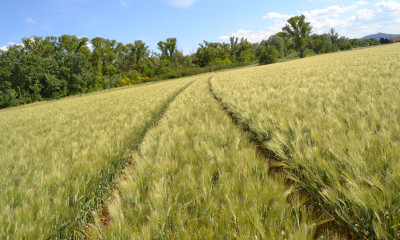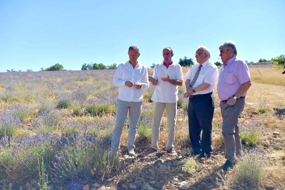 Les élus et l’agriculteur se rendent sur une parcelle cultivée par un voisin, lequel est précisément en train de récolter. « La campagne a commencé, on a généralement un créneau assez précis. Il faut que les lavandes soient parvenues à un certain degré de maturité, et ensuite, il faut faire vite pour éviter le desséchement, surtout quand on a des grosses chaleurs comme en ce moment », explique Lionel Fra. Juste de l’autre côté de la route, un de ses champs d’épeautre. « Je suis en bio, je fais des rotations de sept ans sur mes parcelles. J’alterne avec l’épeautre. Avant, on avait aussi un élevage ovin, les brebis nous permettait de désherber naturellement les lavanderaies. Mais avec le loup, on a été obligé d’arrêter, car on n’avait pas assez de bêtes pour pouvoir payer un berger. »