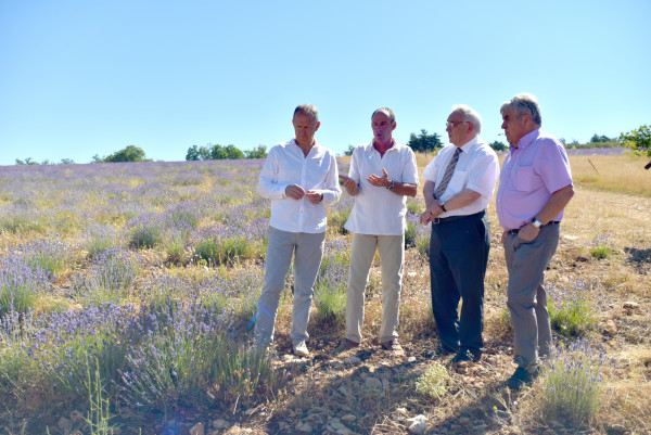 En cette belle journée de la mi-juillet, le président du Conseil départemental de Vaucluse, Maurice Chabert, le premier vice-président, Christian Mounier, également président de la commission agriculture, et Max Raspail, conseiller départemental du canton de Sault se retrouvent à côté de Lagarde d’Apt, dans la jolie petite ferme de Lionel et Christine Fra. Au programme de cette demi-journée passée sur le plateau d’Albion : une découverte des filières lavande et épeautre, au cœur de l’économie de cette partie du département.