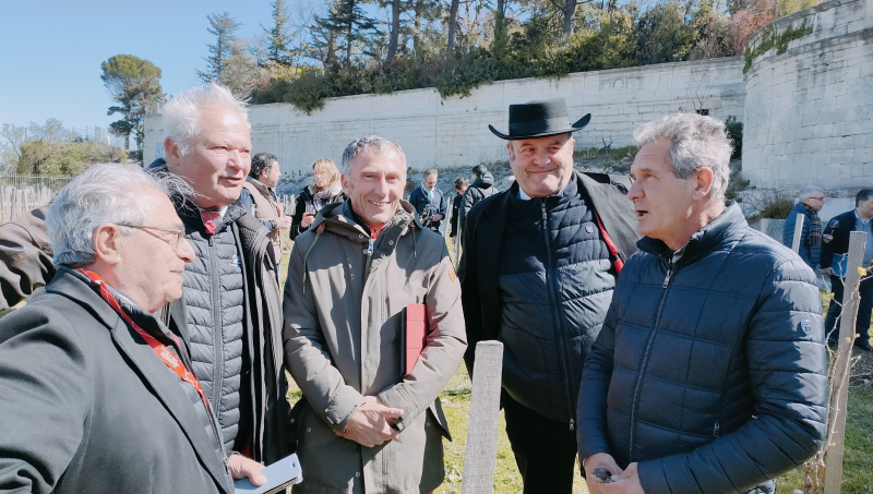 Sous les bourrasques d'un froid mistral, les Compagnons des Côtes du Rhône et leurs invités ont gravi le Rocher des Doms, pour procéder à la traditionnelle taille des 544 pieds de leur vigne aux 13 cépages, surplombant le Rhône.