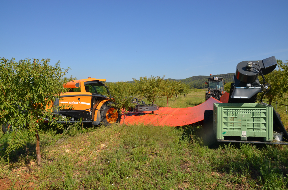 À l'occasion de ce chantier de récolte, la société Pellenc a prêté à la SAS 'Amandes de la Renjardière' un dispositif de récolte mécanisé, constitué d'un vibreur frontal de dernière génération, et d'une bâche automatique attelée. "Ce sont des machines qui ont été développées au départ pour la récolte des olives", explique Fakhri Souissi, chef du département 'Arboriculture' chez Pellenc. "Le développement du marché des amandes nous a amenés à les adapter à cette production. C'est un dispositif qui recourt forcément à pas mal de technologies. Nous formons donc les utilisateurs pendant la première semaine d'usage. Mais une fois formés, on peut atteindre un rendement de deux à trois arbres à la minute."