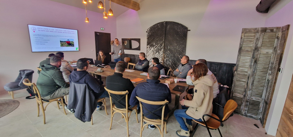 Chaque groupe est composé d'une dizaine de viticulteurs, accompagnés d'un responsable de secteur. Les premières réunions ont débuté en octobre 2023. "Elles étaient essentiellement tournées vers de l'information sur le rappel des objectifs du groupe et la mise au point ensemble d'un fonctionnement pragmatique pour tous. Le but est que chaque groupe propose et s'approprie la ou les thématiques qu'il souhaite travailler. Pour cette première année où l'on démarrait d'une feuille blanche, on leur a proposé un programme autour de trois ou quatre formations, menées cet hiver, sur la nutrition azotée du vignoble, la protection sanitaire, les biostimulants, le choix et la conduite des couverts végétaux, avec la mise en place d'une plateforme d'essais. L'objectif n'est en rien commercial, mais bien de développer des solutions ensemble, tout en leur amenant une expertise complémentaire et en les accompagnant à leur mise en œuvre. On a mis les experts de la CAPL à disposition des groupes."